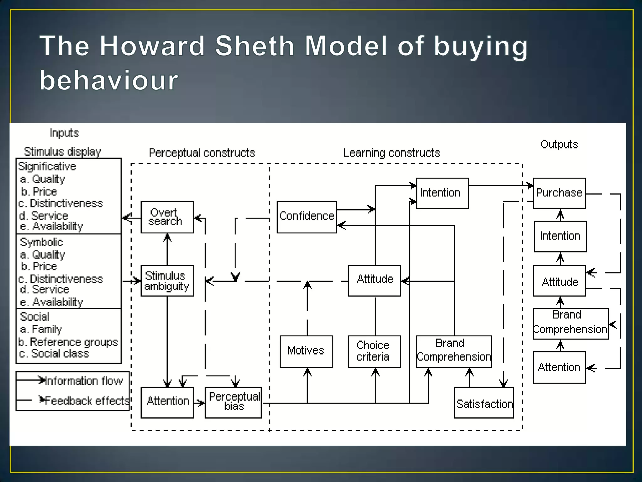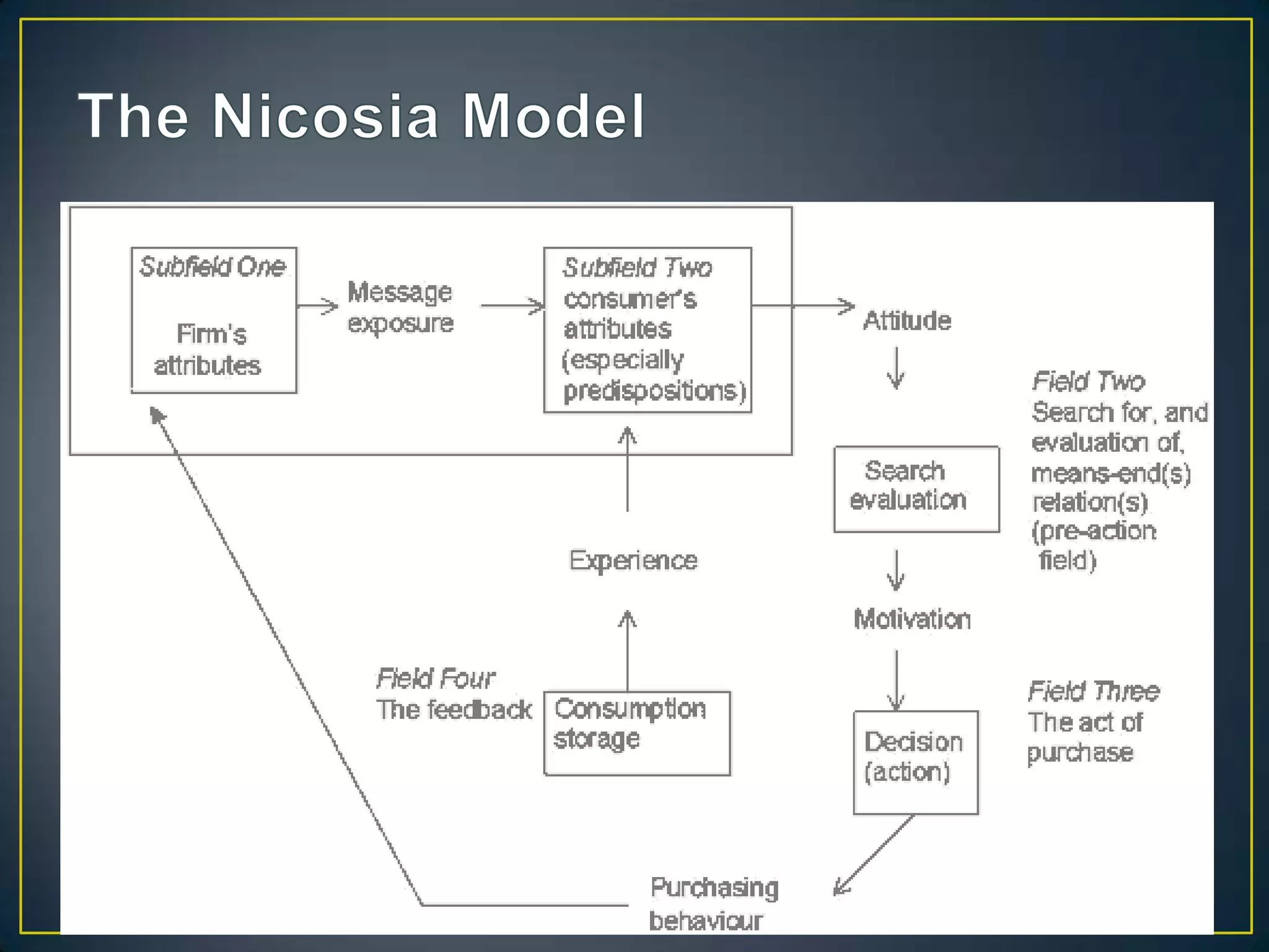 - The Nicosia model explains consumer behavior as a system with stimuli as input and behavior as output across four fields: consumer/firm attributes, search/evaluation, purchase, and post-purchase.