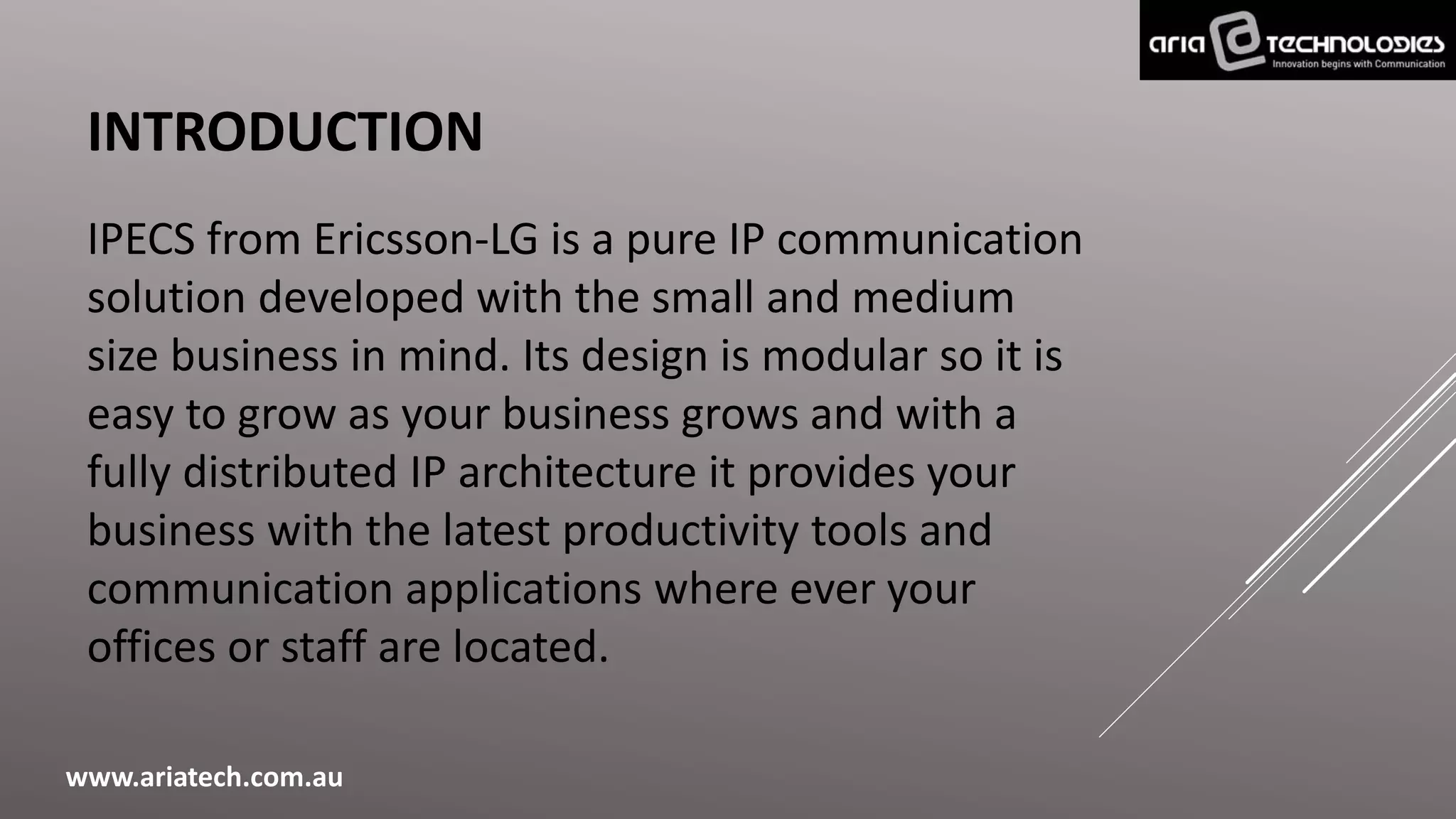 The document introduces ipecs, an IP communication solution by Ericsson-LG designed for small and medium-sized businesses, featuring a modular design for scalability. It outlines various models of IP handsets including the premium lip-9070 with video capabilities, and other models suitable for executives and standard use. Each handset variant offers specific features to enhance business communication productivity.