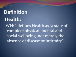 The document discusses various definitions and models of health, prevention, and nursing's role in health promotion. It defines health according to WHO and describes views that health is more than just the absence of disease. It also summarizes levels of prevention from primordial to tertiary. Several health models are explained briefly, including Health Belief Model, Health Promotion Model, Neuman Systems Model, and Nightingale's Environmental Theory. Health promotion frameworks like PRECEDE-PROCEED and OMAHA System are also summarized. Milio's framework for prevention focusing on community-oriented care is described.