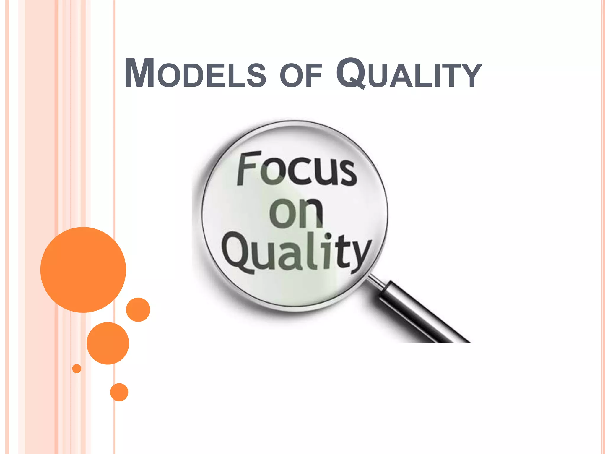 This document discusses several models of quality management including Deming Prize, the American Model of Excellence in Management, and the Malcolm Baldrige model. It provides brief descriptions of each: