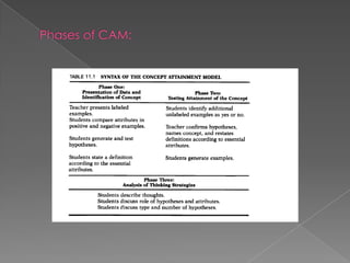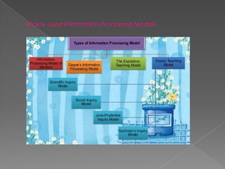 Models of teaching are instructional designs that describe learning environments and interactions to cause specific changes in student behavior. There are several families of models including social, information-processing, personal, and behavioral systems. Models aim to accomplish common educational goals, are research-based, and conform to philosophical orientations. Jerome Bruner's work emphasized that students actively construct knowledge and proposed three stages of representation: enactive, iconic, and symbolic. Bruner also advocated for discovery learning and a spiral curriculum.