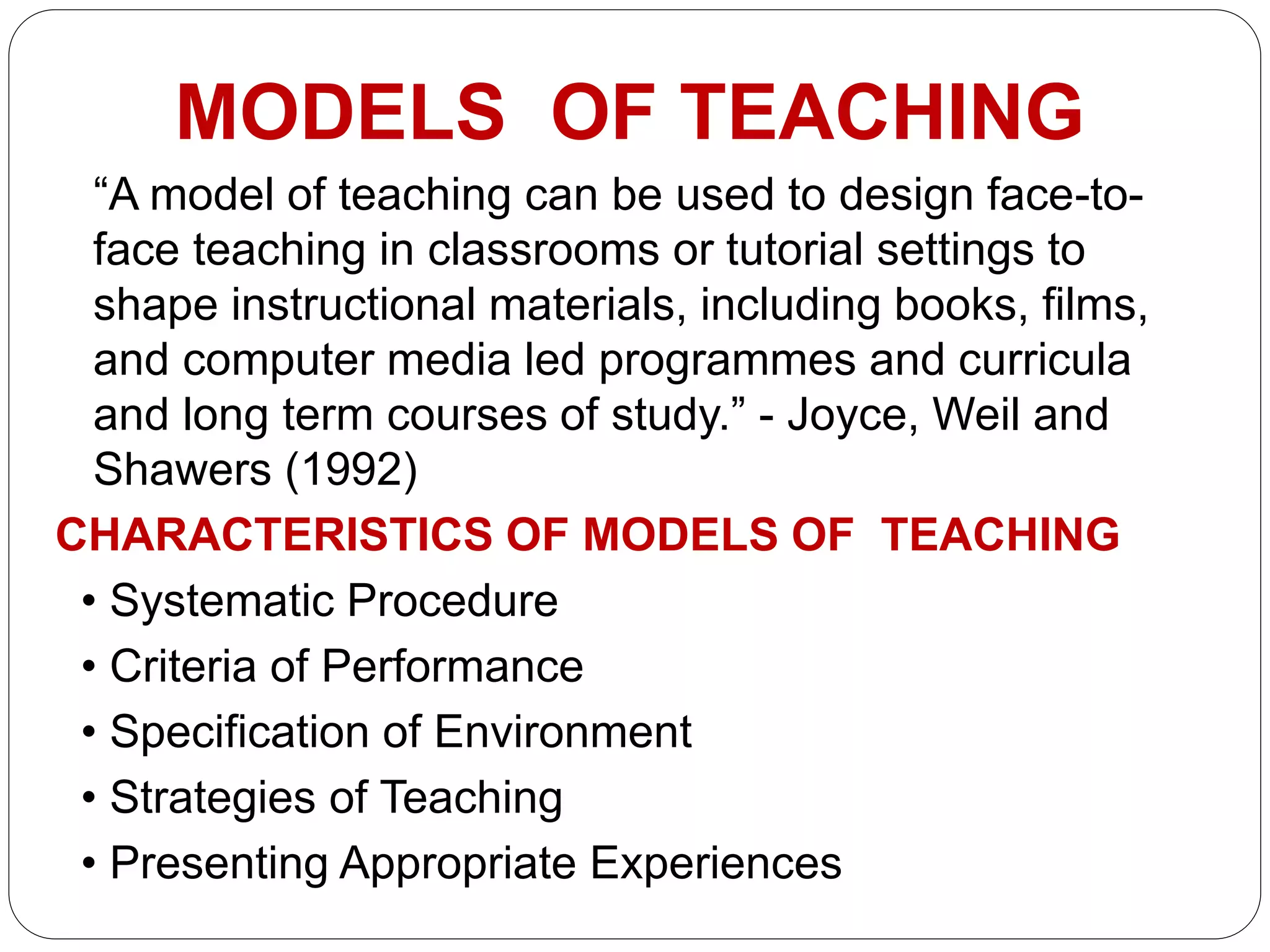 This document discusses models of teaching, which provide systematic procedures and criteria to design instruction. There are four main families of teaching models: social models that focus on social goals, information processing models that enhance understanding, personal models that develop selfhood, and behavioral models based on behaviorism. Effective models create an optimal learning environment, specify teacher and student roles, and can be used to design curriculum, materials, and guide teaching activities.