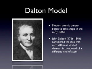 The document summarizes the development of atomic models over time from Dalton's model to the current quantum mechanical model. Dalton imagined atoms as spheres that differed in size and mass. Thomson discovered the electron and proposed the "plum pudding" model. Rutherford's gold foil experiment revealed the tiny, dense nucleus. Chadwick discovered neutrons in the nucleus. Bohr incorporated electron shells. The current quantum model depicts electrons as clouds surrounding the nucleus.