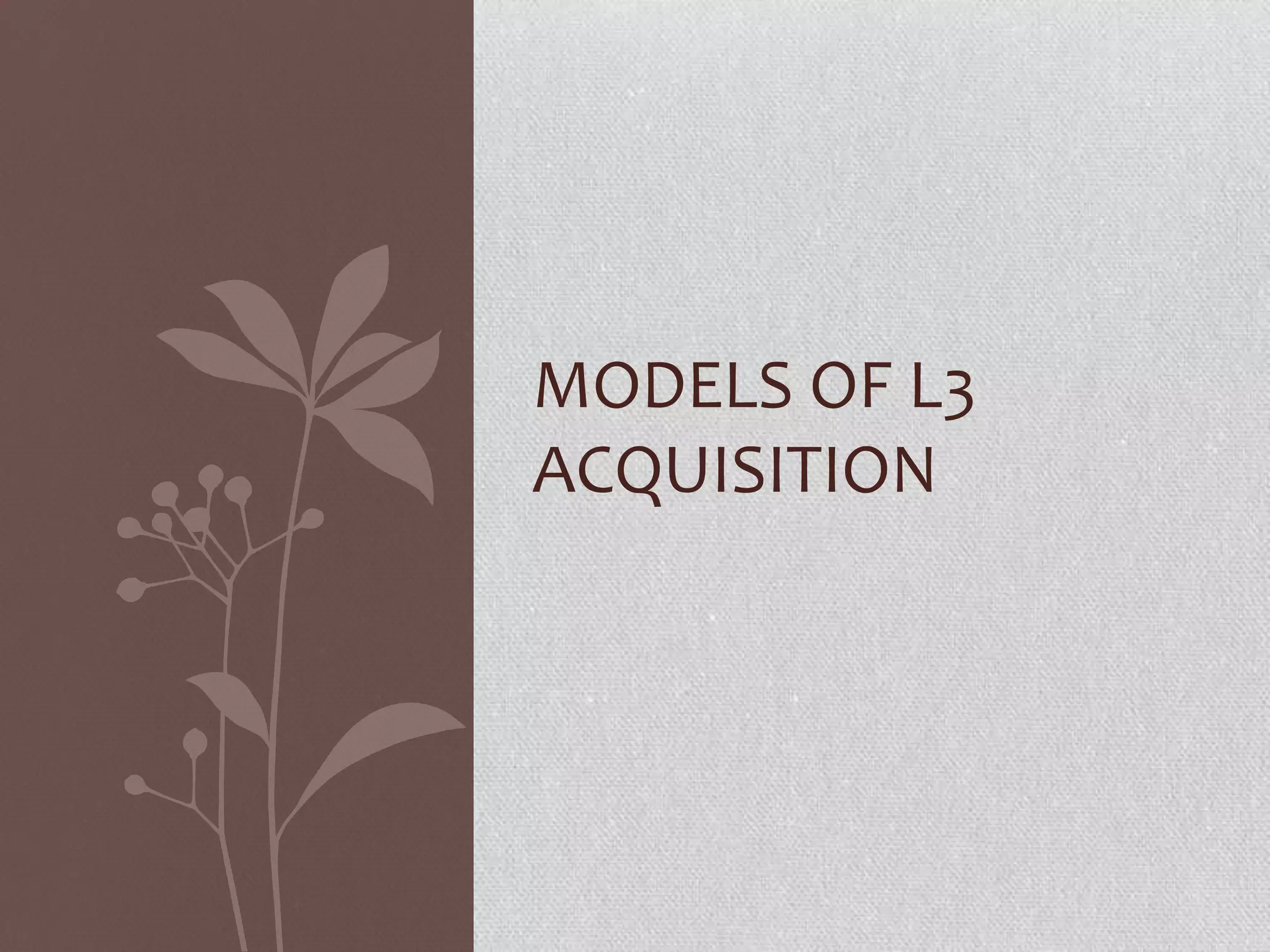 This document discusses three models of third language acquisition: the Cumulative Enhancement Model, the L2 Status Factor model, and the Typological Primacy Model. The Cumulative Enhancement Model proposes that prior languages can facilitate acquisition of a new language. The L2 Status Factor model claims the second language plays a privileged role in third language transfer. The Typological Primacy Model suggests transfer is conditioned by typological similarities between the languages.