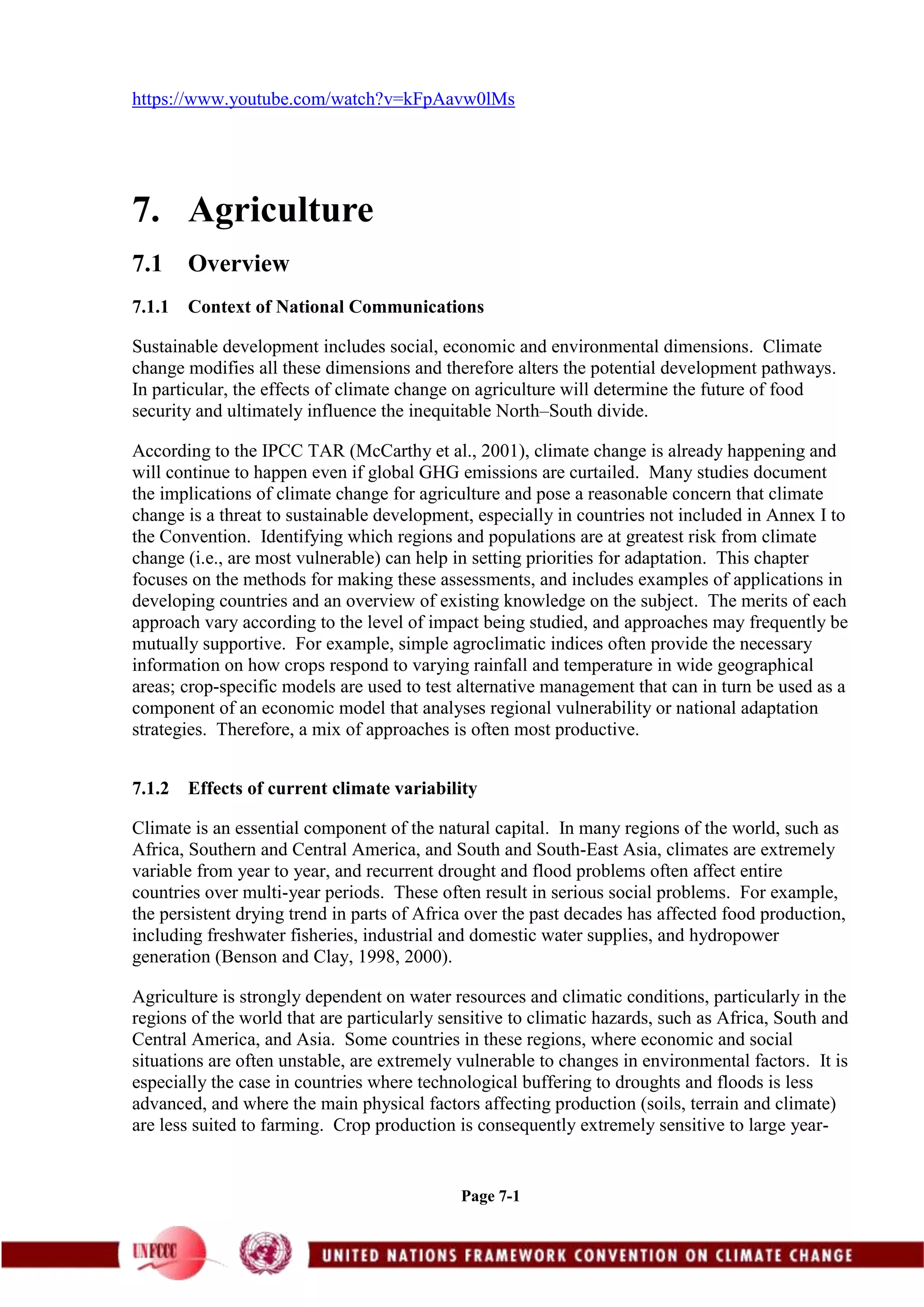 Climate change will have significant impacts on global agriculture and food security according to this document. The effects of climate change on agriculture will influence food security and development pathways between the global North and South. Several assessment methods are used to analyze the biophysical and socioeconomic impacts of climate change on agriculture, including agroclimatic indices, statistical models, process-based models, and economic tools. However, there are also many uncertainties associated with climate change projections and agricultural modeling. A combination of approaches is often needed to fully understand how climate change may affect agriculture at regional and local levels.
