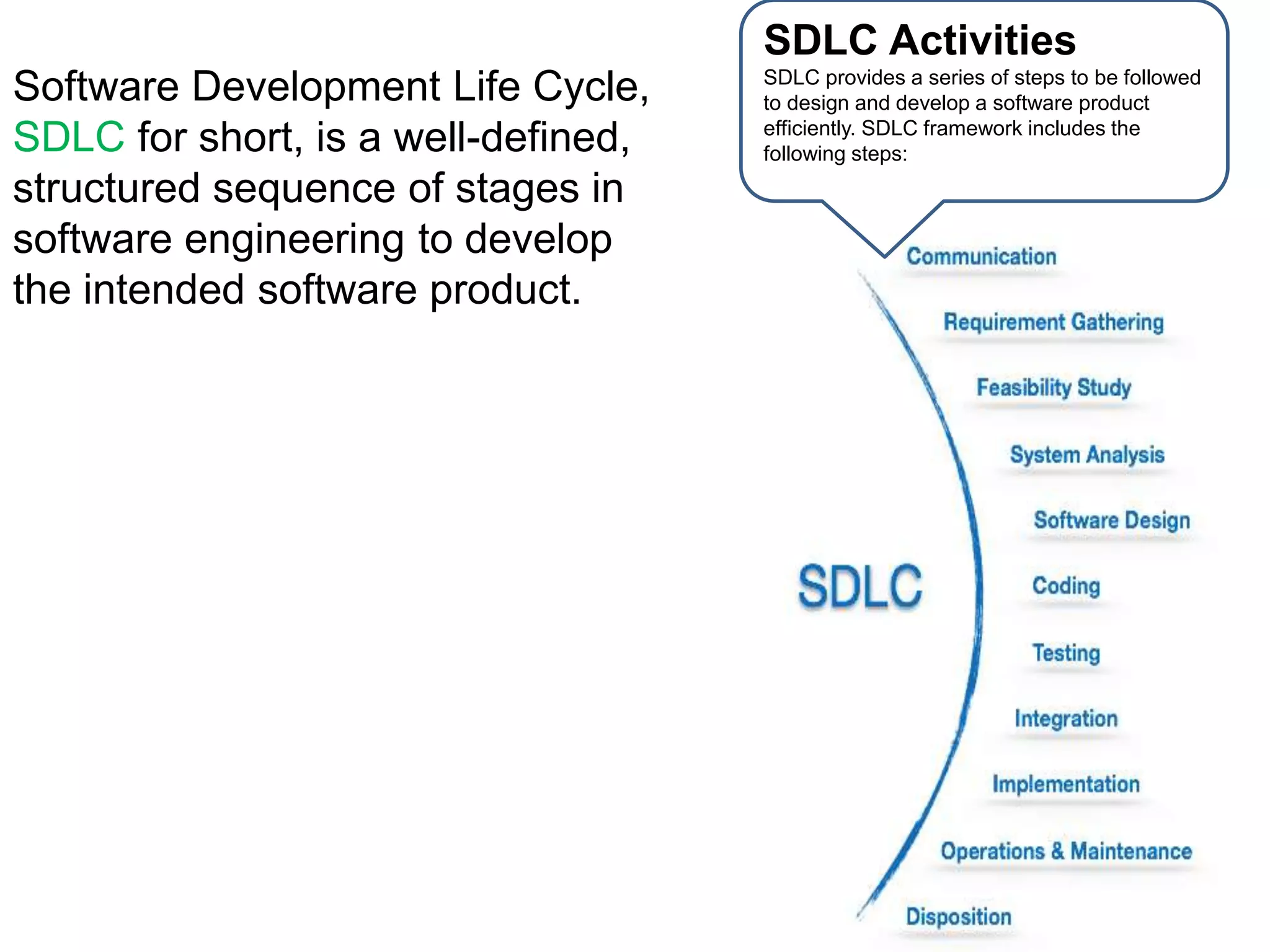 The Software Development Life Cycle (SDLC) is a structured process for developing software that consists of multiple stages. The Waterfall model was the first process model introduced and consists of sequential phases where each phase must be completed before moving to the next. Iterative models develop software through repeated cycles, implementing portions of requirements at a time and incorporating feedback between cycles.
