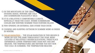 The document discusses the climatic zones of India, focusing primarily on the moderate climate, characterized by mild summers, cool winters, and significant rainfall. It also outlines building design approaches and materials used in specific case studies, particularly in Bangalore and Pune, emphasizing passive design strategies for energy efficiency and comfort. The text highlights the importance of natural ventilation, heat gain reduction, and eco-friendly construction practices in addressing local climatic conditions.
