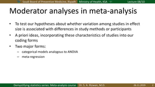 This document discusses a lecture on meta-analysis led by Dr. S.A. Rizwan, focusing on statistical techniques for analyzing data across studies, including the use of random effects models and meta-regression. It covers various aspects such as assumptions for variance components, differences in effect sizes concerning categorical moderators, and methods for testing group differences. The lecture emphasizes the importance of understanding variability in study results and using appropriate statistical methods to draw conclusions from meta-analyses.