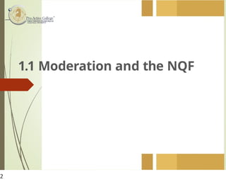 The document provides an overview of moderation within the National Qualifications Framework (NQF), defining moderation as a process to ensure fair, valid, and reliable assessments. It outlines the roles of internal and external moderation, the functions of moderators, and the registration and conduct codes for moderators. Additionally, it explains the importance of consistency in assessment across providers and the administrative procedures involved in moderation.
