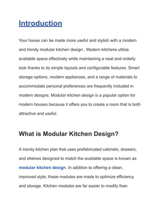 Modular kitchen design is a contemporary approach that utilizes prefabricated components for greater efficiency and aesthetic appeal in home kitchens. It offers customizable layouts and smart storage solutions, optimizing space while maintaining a modern look. This design is not only trendy and practical but also budget-friendly, allowing homeowners to create stylish kitchens that fit their needs and preferences.
