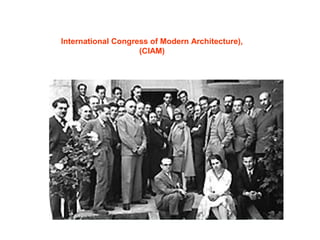 The document discusses the Congrès Internationaux d'Architecture Moderne (CIAM) or International Congress of Modern Architecture, an organization of modern architects founded in 1928 that held international conferences until 1959. It highlights two important conferences - "The Functional City" in 1933 that broadened CIAM's scope from architecture to urban planning, and proposed resolving social problems through strict functional zoning and tall apartment blocks spaced far apart. Another was the controversial "Athens Charter" from 1942 that committed CIAM to rigid functional cities with citizens housed in high, spaced apartment blocks separated by green belts.