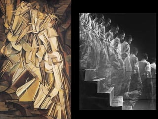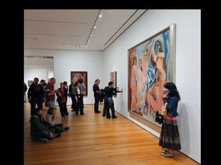 The document provides an overview of major artistic movements in early 20th century modern art, including Fauvism, Expressionism, Cubism, Futurism, Dada, Suprematism, De Stijl, and Surrealism. It summarizes the goals and characteristics of each movement, and provides examples of influential artists and their works such as Matisse, Kandinsky, Picasso, Duchamp, Mondrian, Dali, and others. The document also discusses the impact of events like World War I and the development of abstraction on the rejection of traditional styles of art during this period.