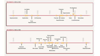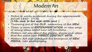 Modern art began around 1860 and lasted until around 1970, sparked by artists throwing out old conventions and embracing experimentation. This led to new ways of seeing and representing the world directly through the artist's experiences. Many new styles emerged like Impressionism, Symbolism, Art Nouveau, Fauvism, Expressionism, Cubism, Dada, Constructivism, Surrealism, Abstract Expressionism, Pop Art, Optical Art, Photorealism and other avant-garde styles. Nearly every new style was initially met with ridicule but eventually settled into history, influencing future generations of artists.