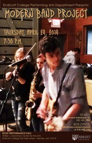 The Endicott College Performing Arts Department is presenting the Modern Band Project on April 24, 2014 at 7:30 PM in the Rose Performance Hall located at the Walter J. Manninen Center for the Arts at Endicott College in Beverly, MA. General admission tickets are $5 and admission is free for Endicott College students with an ID. Tickets can be purchased online or by calling the box office.