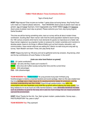 The document is a script for a game show episode of Family Feud, featuring teams that answer questions on the contributions of various historical figures in modern sciences, including Louis Pasteur and Alexander Graham Bell. The teams engage in rounds discussing contributions such as pasteurization, animal vaccination, and communication inventions like the telephone. The game showcases their knowledge while revealing the impact of these inventions on society and their limitations.