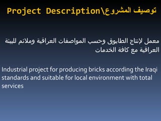يتعلق المشروع بإنشاء معمل حديث لإنتاج الطابوق وفق المواصفات العراقية، بموقع في محافظة واسط وتحت استثمار محلي وأجنبي. يهدف المشروع إلى تلبية الطلب المتزايد على البناء بإنتاج 500,000 طابوقة يوميًا، مع تقدير تكلفة 20 مليون دولار. يتوفر للموقع مزايا مثل سهولة النقل والموارد اللازمة للإنتاج، ويعكس الحاجة الكبرى لمثل هذه المنشآت بالنظر إلى المشاريع الاستثمارية المتزايدة.