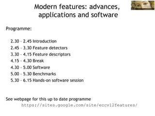 The document discusses modern feature detection techniques. It provides an introduction and agenda for a talk on advances in feature detectors and descriptors, including improvements since a 2005 paper. It also discusses software suites and benchmarks for feature detection. Several application domains are described, such as wide baseline matching, panoramic image stitching, 3D reconstruction, image search, location recognition, and object tracking.