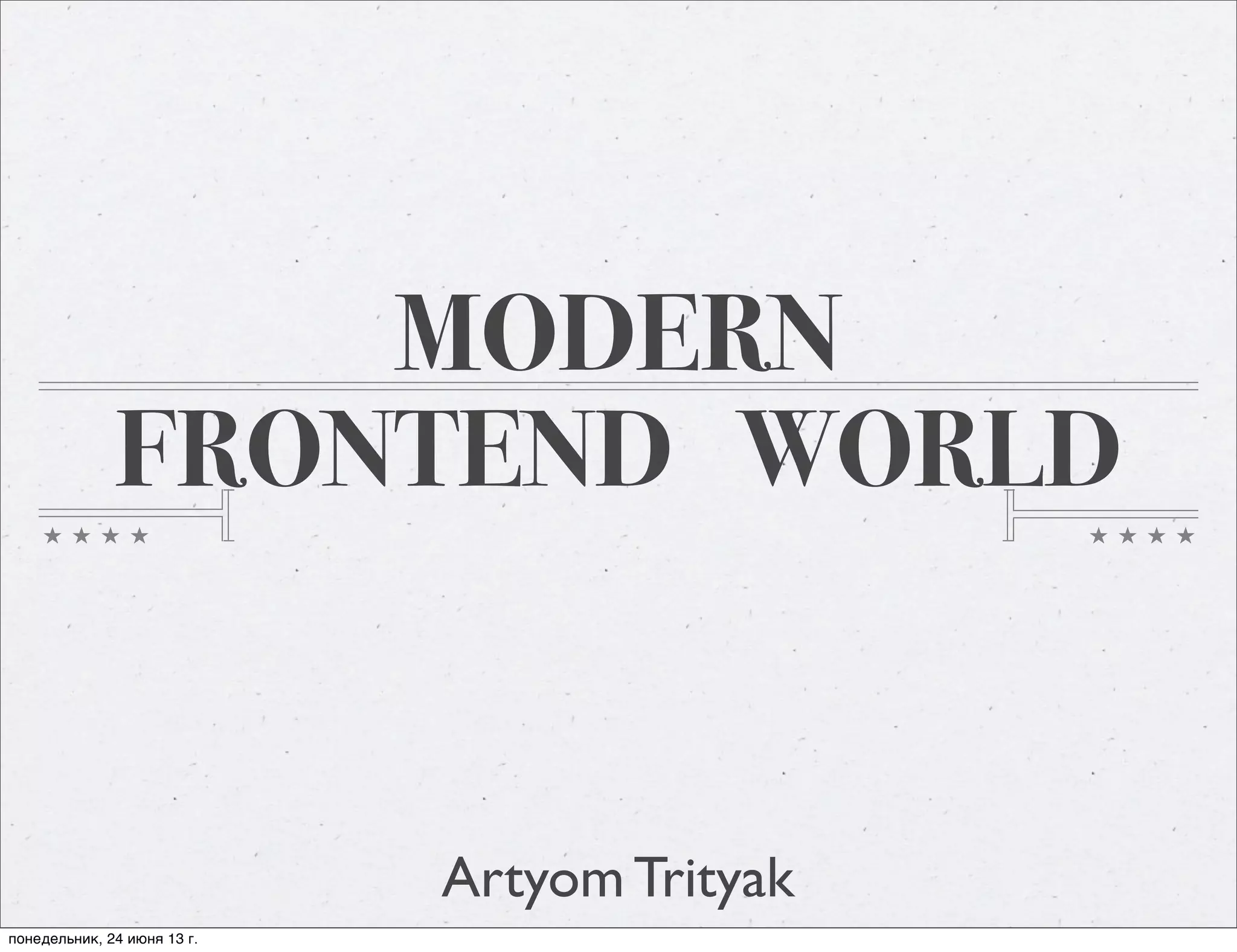 Документ рассматривает современные тенденции во фронтенд-разработке с акцентом на использование JavaScript и CSS. Упоминаются инструменты, такие как Karma, которые помогают в процессе разработки. Дата публикации документа — 24 июня 2013 года.