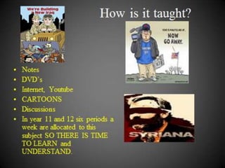 This document provides an overview of the Modern History course in years 11 and 12. It discusses what is studied, including slavery, the French Revolution, civil rights movements, and World War 1. Students study one national study like Germany or Russia, as well as one personality and international conflict. The course sharpens analytical skills and allows students to better understand the complex modern world by linking geography, economics, politics and culture. It is recommended for students interested in learning about the world and those wanting to improve writing and research abilities to benefit their future careers.