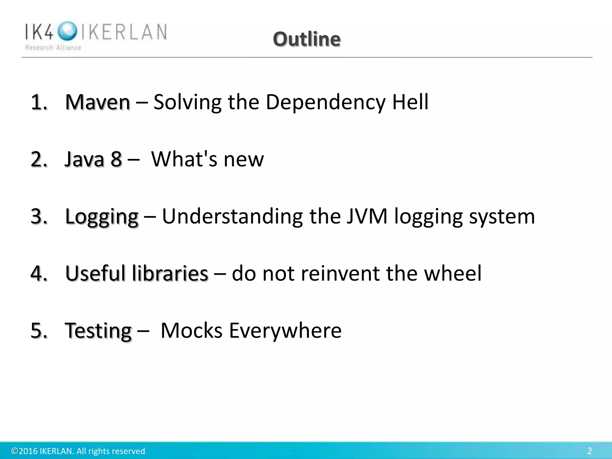 This document provides an overview of Maven, Java 8 features, logging, useful libraries, and testing in Java. It discusses how Maven can help solve dependency issues, key Java 8 additions like lambdas, streams and default methods. Logging with SLF4J and Logback is explained. Popular libraries like Lombok, Guava and Apache Commons are mentioned. Finally, unit testing with JUnit and mocking with Mockito is covered at a high level.
