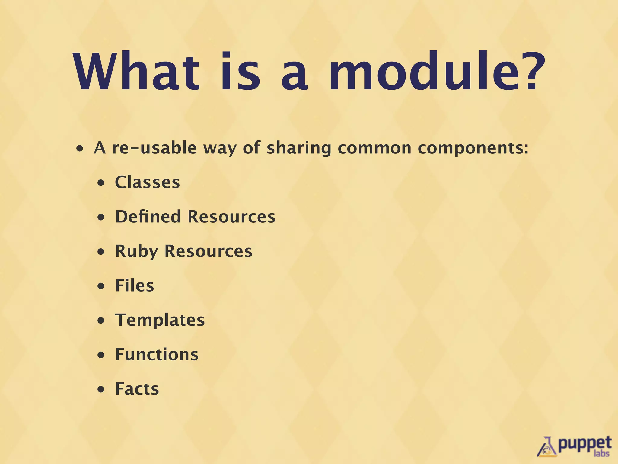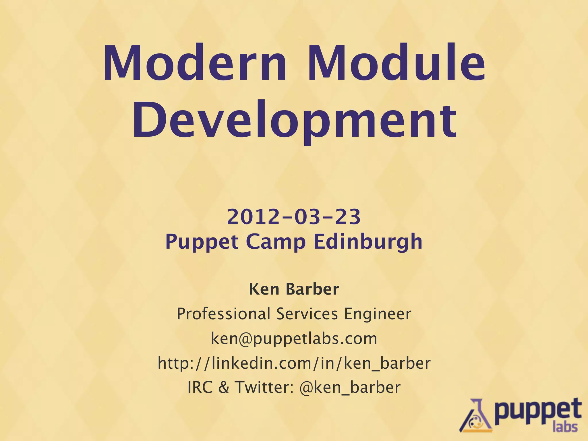 The document provides information on modern Puppet module development best practices. It discusses what modules are and common patterns like package, config, service that address 80% of module needs. It also covers validation of module parameters using Kwalify schemas, testing modules with rspec-puppet, and packaging modules for release on the Puppet Forge using the puppet-module tool. The document emphasizes the importance of coding style, linting with puppet-lint, and following patterns and best practices to create high quality, reusable modules.