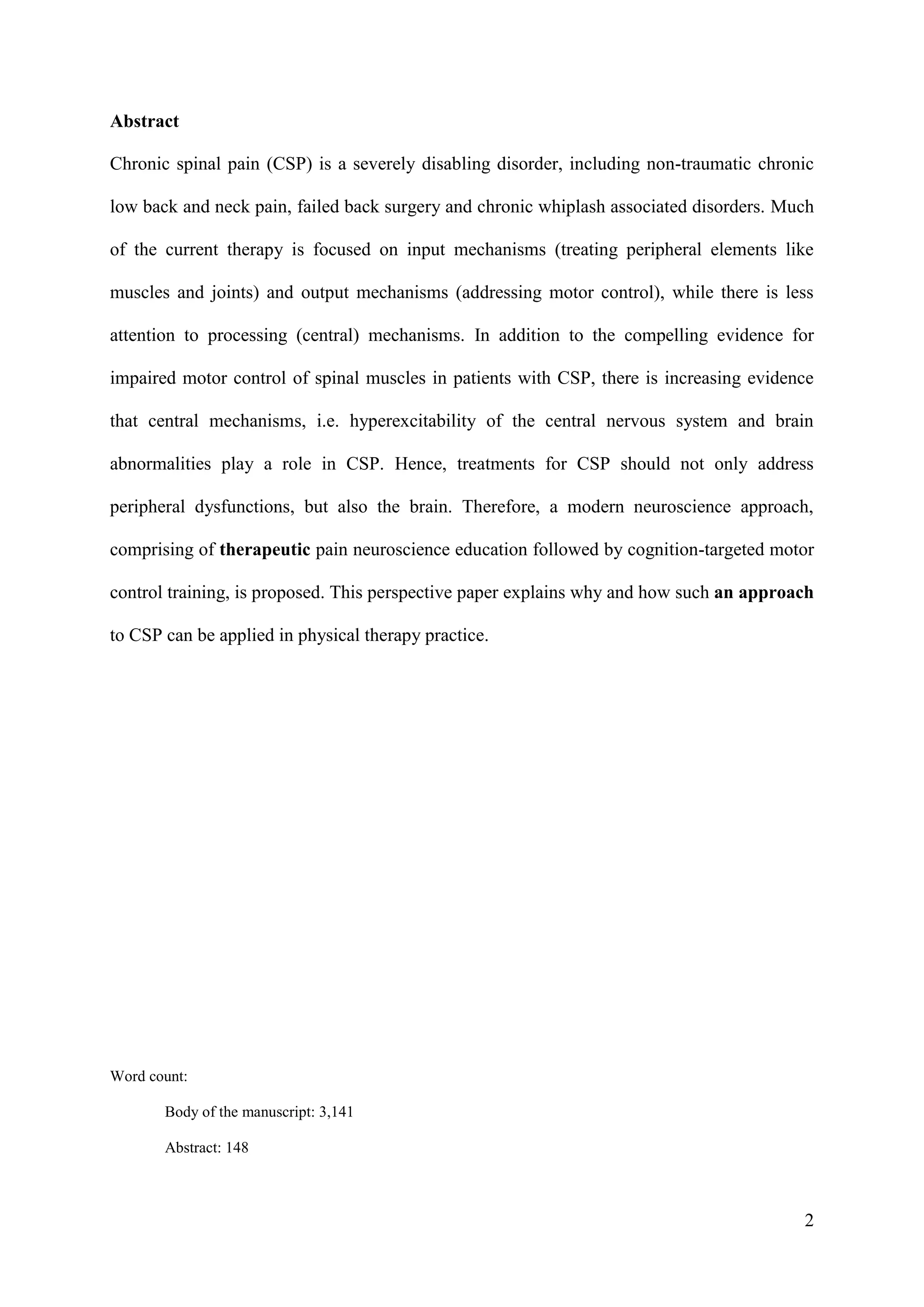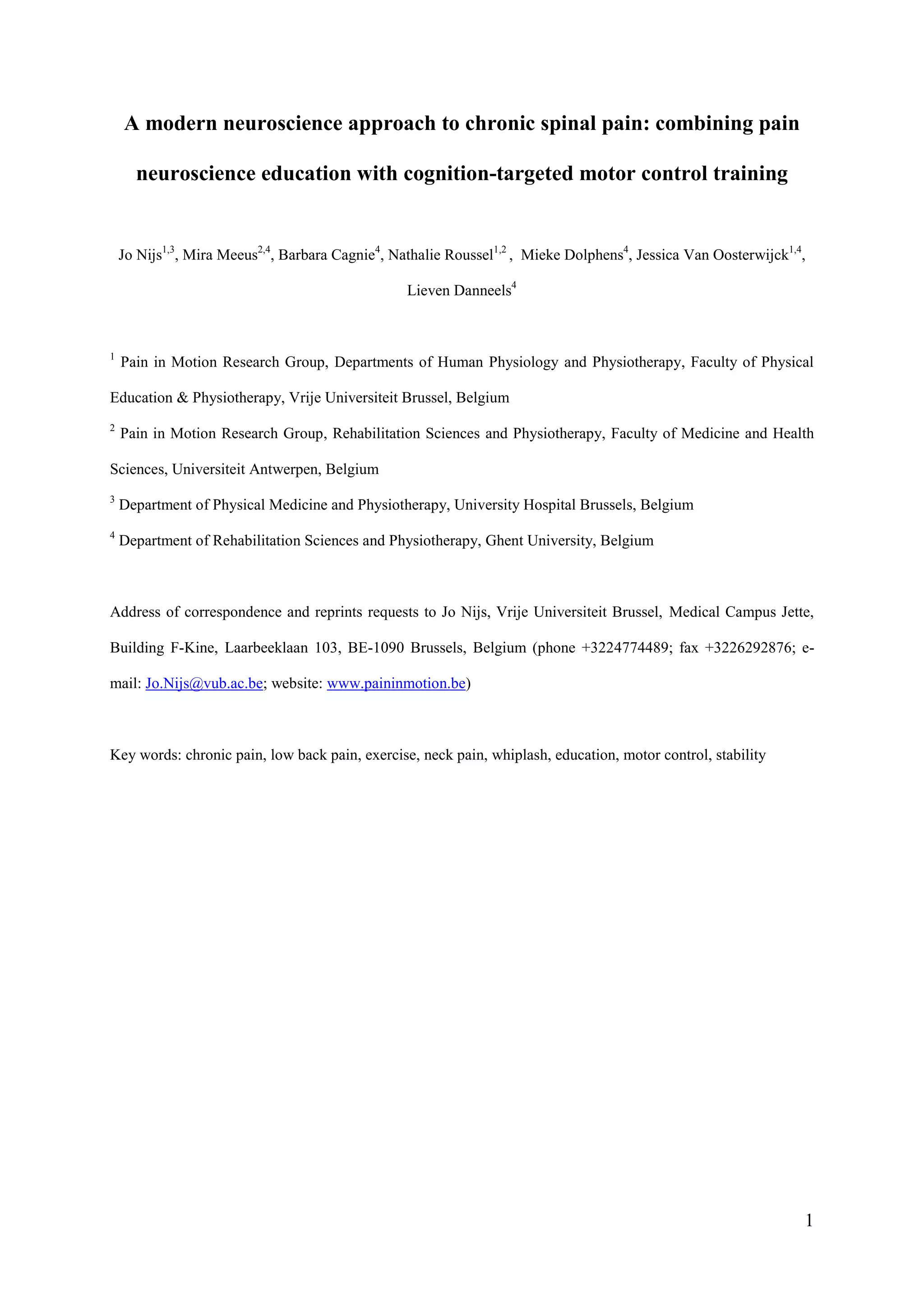 This document describes a modern neuroscience approach for treating chronic spinal pain that combines pain neuroscience education with cognition-targeted motor control training. It discusses evidence that chronic spinal pain patients have abnormalities in brain structure and function, including decreased grey matter density, impaired motor control-related brain areas, and a sensitized brain due to central sensitization. The proposed approach has three phases: 1) Therapeutic pain neuroscience education to reconceptualize pain and explain central sensitization, 2) Cognition-targeted motor control training to address motor dysfunction, 3) Both 1) and 2) together to target peripheral and central mechanisms of chronic spinal pain.