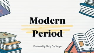 The document provides an overview of modern period literature from the late 19th century through the early 20th century. It describes modernist literature as representing a departure from previous traditions through its experimental approaches to storytelling, language, and themes. Key characteristics included a focus on individual subjective experiences, the use of stream-of-consciousness narration, and nonlinear/fragmented structures. Modernist works also explored themes of absurdity, used symbolism and allegory, and emphasized formal literary techniques. The movement reflected profound societal changes and was influenced by events like the world wars. Prominent modernist authors mentioned include James Joyce, Virginia Woolf, Franz Kafka, F. Scott Fitzgerald, T.S. Eliot, Ernest