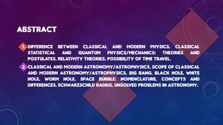 Classical physics deals with non-extreme conditions where quantum mechanics (QM) and Einstein's theory of relativity (ER) are not needed. Modern physics incorporates elements of QM or ER, or both, and is needed when dealing with extreme conditions like very small distances, high velocities, or large distances. Key differences between classical and modern physics include: particles being distinguishable versus indistinguishable, the size of the phase space cell, restrictions on particles due to principles like Pauli Exclusion, and possible arrangements of particles in cells.