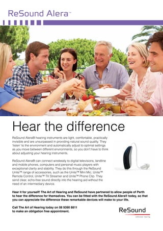 The document provides an overview of hearing loss, its prevalence, and the importance of early intervention, highlighting the impact on quality of life and economic factors. It details various hearing loss types, their causes, and treatment options, including modern hearing aids like the Resound Alera®, which are now available with financial assistance for veterans and pensioners in Australia. Additionally, it emphasizes the role of The Art of Hearing in offering independent audiological services and support for individuals seeking solutions for hearing loss.