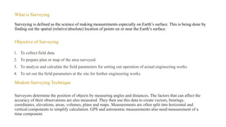 Modern surveying techniques provide accurate measurements for civil engineering projects. Techniques like total stations, digital levels, GPS, and data collectors allow surveyors to measure horizontal and vertical angles as well as distances electronically. This improves accuracy and efficiency over traditional methods. Specific applications in civil engineering include road, tunnel, and bridge alignment, infrastructure mapping for urban planning, and construction site layout and monitoring. The summarized data can be imported into CAD software for modeling and analysis. Overall, modern surveying techniques enhance accuracy and productivity for civil engineering design and construction.