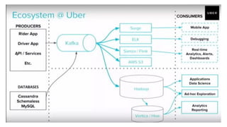 The document discusses various technologies used by ride-sharing services like Uber, Lyft, and Cabify for efficient spatial indexing and dispatch optimization. It highlights the importance of GPS and a distributed system using hashing for managing workloads and improving estimated time of arrival (ETA) calculations. Additionally, it briefly mentions tools like Terraform, Docker, and Mesos used in their infrastructure.