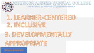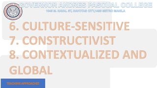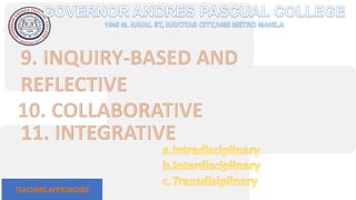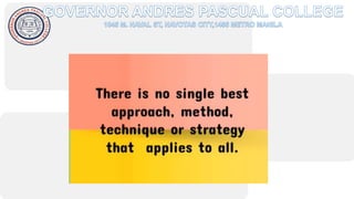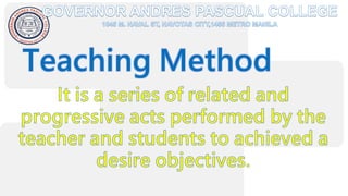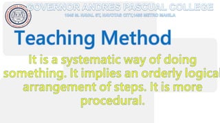 The document discusses modern teaching methods used in education. It describes 5 methods: lecture method, discussion method, inquiry-based method, cooperative learning method, and project-based learning method. For each method, it provides an example of how that method can be implemented in the classroom. The document concludes by listing references for further information on teaching approaches and methods.