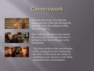 This document analyzes shots from a film scene showing a young girl practicing shooting a man with a gun. It describes several shots - a medium shot showing her interest in the man and the gun in the foreground, and a close up showing her concentration as she takes aim. Sound and music are used to build tension. An eye line match and shot reverse shots are employed to show reactions. Props like the gun and walkie-talkies, and costumes like an orange tracksuit, are analyzed.