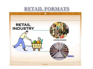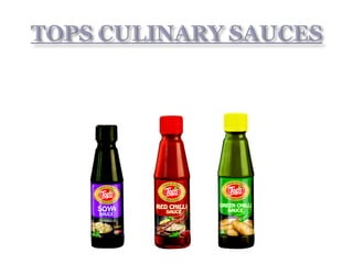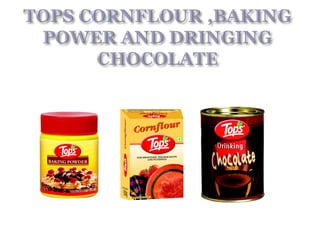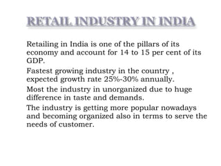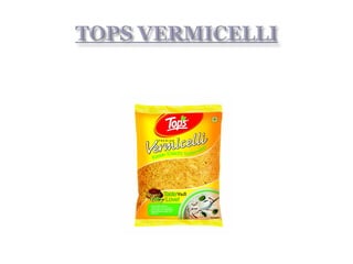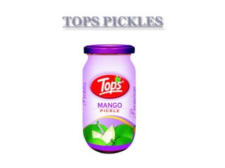 Retailing in India accounts for 14-15% of GDP and is one of the fastest growing industries in the country, expected to grow 25-30% annually. However, most retailing remains unorganized due to differences in tastes and demands across India. The industry is becoming more organized to better serve customer needs. Tops markets a variety of food products in India including pickles, jams, ketchup, vermicelli, cake mixes, and more. It aims to provide high quality ingredients and differentiate its products from competitors.