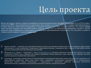 Бизнес-план предполагает разработку многопользовательской онлайн-игры 'Modern Wars' в жанре 3D-шутера с элементами RPG, ориентированной на пользователей от 7 до 40 лет и старше. Игра будет выделяться высокой степенью реализма, возможностью управления разными типами вооружения и завершенной симуляцией, а также предоставлением игрокам уникальных возможностей заработка. Доход предполагается получать через продажи виртуальных товаров и услуги ставок на результат сражений, что является новинкой на рынке похожих игр.