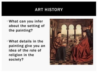 This document provides an overview of the Italian Renaissance and its spread to Northern Europe. It discusses several key factors that fostered the Renaissance in Italy, including thriving city-states, a wealthy merchant class, and Italy's classical heritage. Important Renaissance figures like Leonardo da Vinci and Raphael are mentioned. The document also notes how Renaissance ideas spread north to places like France and the Low Countries, influenced by travelers and royal patrons. Key artistic and literary developments in these northern regions are summarized as well.