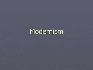 Modernism was a literary movement between 1915 and 1965 that rejected traditional forms and conventions. Modernist writers experimented with stream of consciousness writing and non-linear structures to challenge readers. They consciously warped traditional forms to create something new and rejected realism and naturalism. Modernist works often have a pervasive sense of doubt and darker themes as the writers challenged everything from point of view to the nature of the hero.