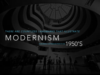 World War I was a devastating war that made use of new, terrible technologies like machine guns, tanks, airplanes, and chemical weapons. It resulted in millions of deaths and contributed to the Russian Revolution and communist rule. World War II was also tremendously destructive, killing two-thirds of the world's population according to estimates, thanks to new technologies like the atomic bomb. Between the two world wars, modern architecture developed through new building materials and designs. Overall, the text discusses how modernism emerged as a rejection of tradition through landmarks like the world wars and their advanced weapons and the development of modern architecture.