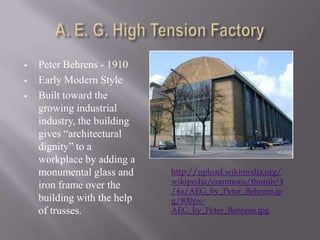The document summarizes key buildings representing different architectural styles in Berlin, Germany from the early 20th century to postmodernism. It describes the A.E.G. High Tension Factory as an early example of modern style that gave "architectural dignity" to industry. It also discusses the Hackesche Höfe as an example of Jugendstil/Art Nouveau that combined residential and commercial spaces. Additionally, it provides details on the Bauhaus school founded by Walter Gropius and influential modernist buildings like Mies van der Rohe's Neue Nationalgalerie and Le Corbusier's Unité d'Habitation in Marseille.
