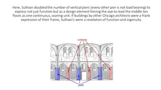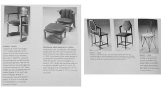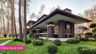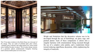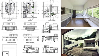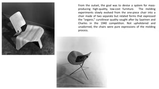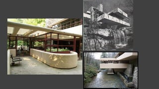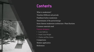 The document provides an overview of modernism as a philosophical and artistic movement that emerged in the late 19th and early 20th centuries, characterized by a departure from romanticism and Victorian styles due to industrialization and societal shifts. It highlights key figures in modern architecture such as Louis Sullivan, Frank Lloyd Wright, and the Eames couple, detailing their contributions and iconic works that reflect modernist principles. Additionally, the document outlines the importance of materials, design elements, and the impact of economics and technology on the evolution of modernism.