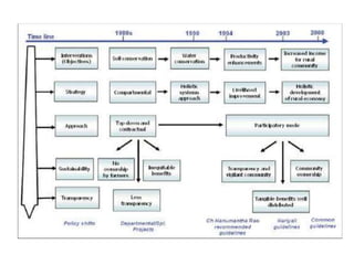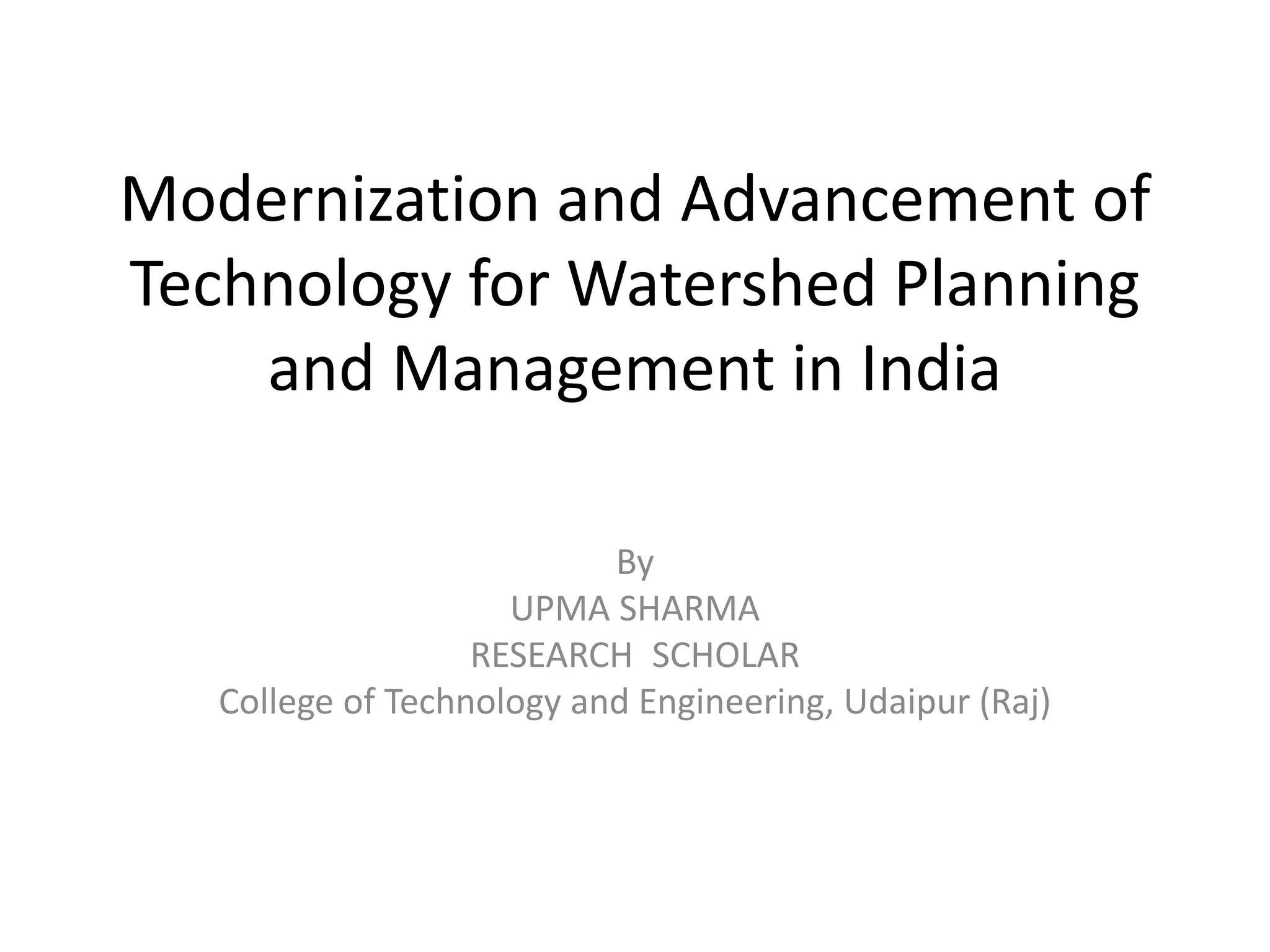 This document discusses the modernization and advancement of watershed planning and management techniques in India. It provides a history of watershed development programs in India since the 1970s. It then discusses some of the major problems with previous watershed development programs, including inequitable distribution of resources. The document advocates for the use of advanced techniques like geographic information systems, remote sensing, hydrological modeling, and other decision support tools to help optimize land and water resource allocation and management. It provides examples of how simulation models, optimization models, multi-objective decision making models, and conflict resolution models can help address different watershed planning challenges. Overall, the document argues integrated watershed modeling approaches can help improve sustainability and natural resource management.