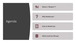 The document discusses modernizing solutions using SharePoint and the Power Platform, emphasizing the transition from traditional tools to user-friendly applications and intelligent workspaces. It outlines reasons for modernization, potential challenges, and solutions for common problems associated with this transition. Key recommendations include embracing new tools, adapting roles, and utilizing available templates and resources to enhance user experience.