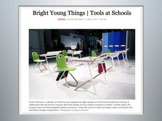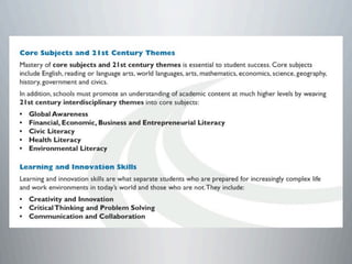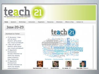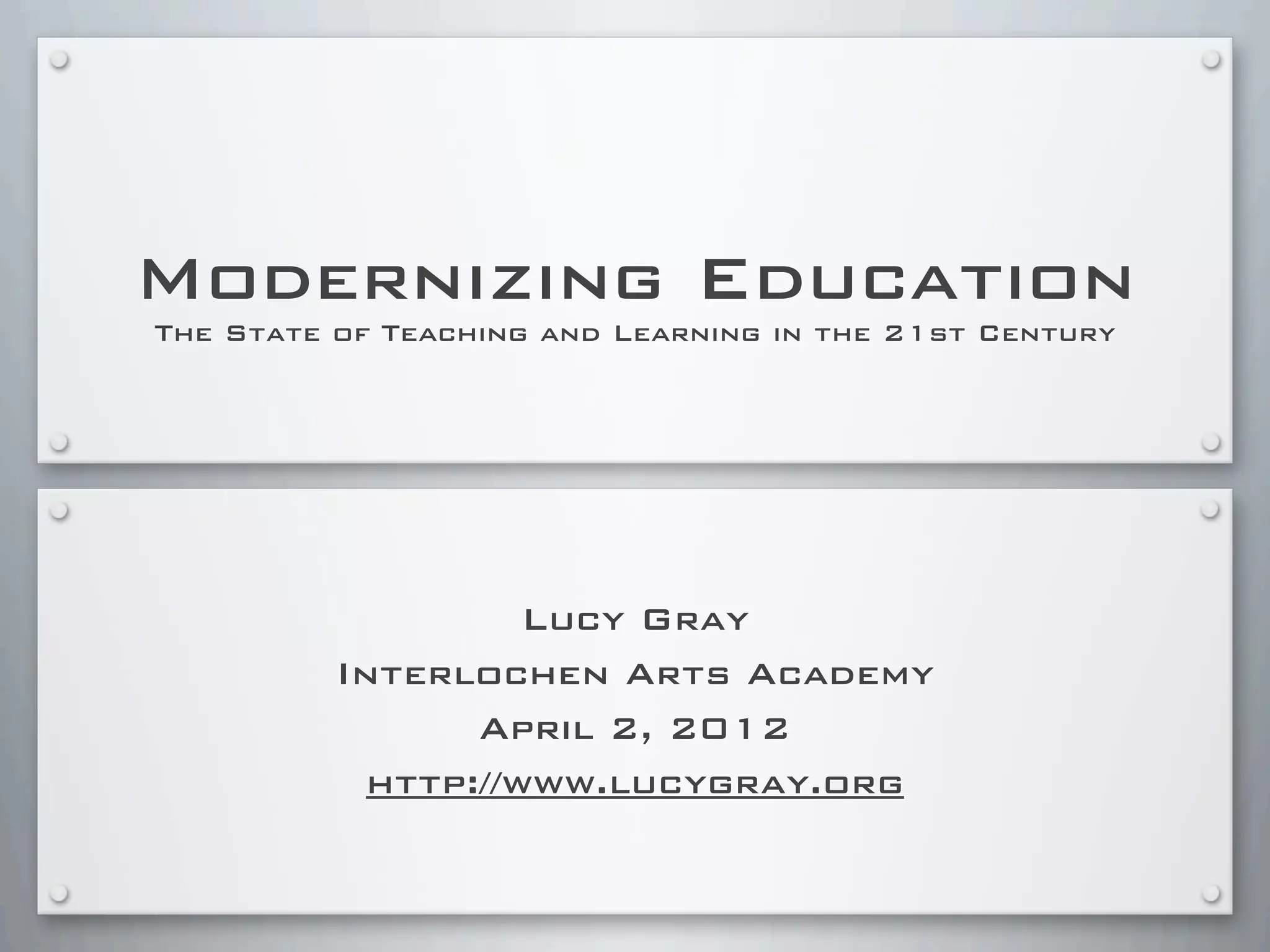 This document provides a summary of Lucy Gray's keynote presentation on modernizing education at the Interlochen Arts Academy on April 2, 2012. The presentation discusses the state of teaching and learning in the 21st century, highlighting trends like increased use of social media, the importance of developing 21st century skills in students, and the need for personalized and globally connected learning. Recommendations are made around leveraging mobile technologies, incorporating web tools into instruction, and expanding digital resources to make learning more experiential. Examples of innovative schools adopting these approaches are also provided.