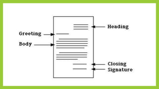 The document outlines the fundamentals of letter writing, focusing on business letters including their structure, obligatory and optional parts, and the importance of clarity, correctness, and courtesy. It also covers the minutes of meetings, types of reports, internal communication methods like memos and notices, and modern communication tools such as emails, teleconferencing, and videoconferencing along with their advantages and disadvantages. Additionally, it provides guidelines for effective email usage in a professional context.