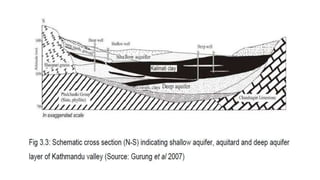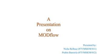 This document provides an overview of a presentation on MODFLOW given by Nisha Belbase and Prabin Banstola. It discusses the history and development of MODFLOW as a groundwater flow model developed by the USGS. It then describes key aspects of MODFLOW including its governing equations, inputs, outputs, versions, advantages, and disadvantages. Finally, it provides examples of MODFLOW being used for numerical modeling of groundwater in the Kathmandu Valley in Nepal.