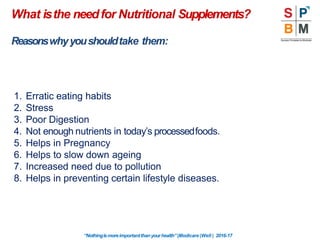 This document provides information about nutritional supplements and their benefits. It discusses reasons for taking supplements such as erratic eating habits, stress, poor digestion, lack of nutrients in processed foods, and increased needs due to pollution. It then focuses on protein, describing what protein is, its importance for the body, signs of deficiency, and presenting various protein supplement products from Modicare. The document also discusses vitamins and minerals, their importance, potential deficiencies, and introduces a multivitamin-multimineral supplement. Finally, it discusses calcium and bone health, the importance of calcium, potential deficiencies, and how bones change over a lifetime.