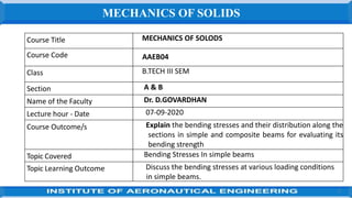 This document discusses bending stresses in simple beams. It begins by outlining the assumptions of simple bending theory, including that beam material is homogeneous, isotropic, and within the elastic limit. It then derives the bending stress formula, showing that stress is proportional to the distance from the neutral axis. The neutral axis is where fiber strains are zero during bending. Several examples are provided to demonstrate calculating bending stresses and properties like modulus of elasticity based on the stress formula.