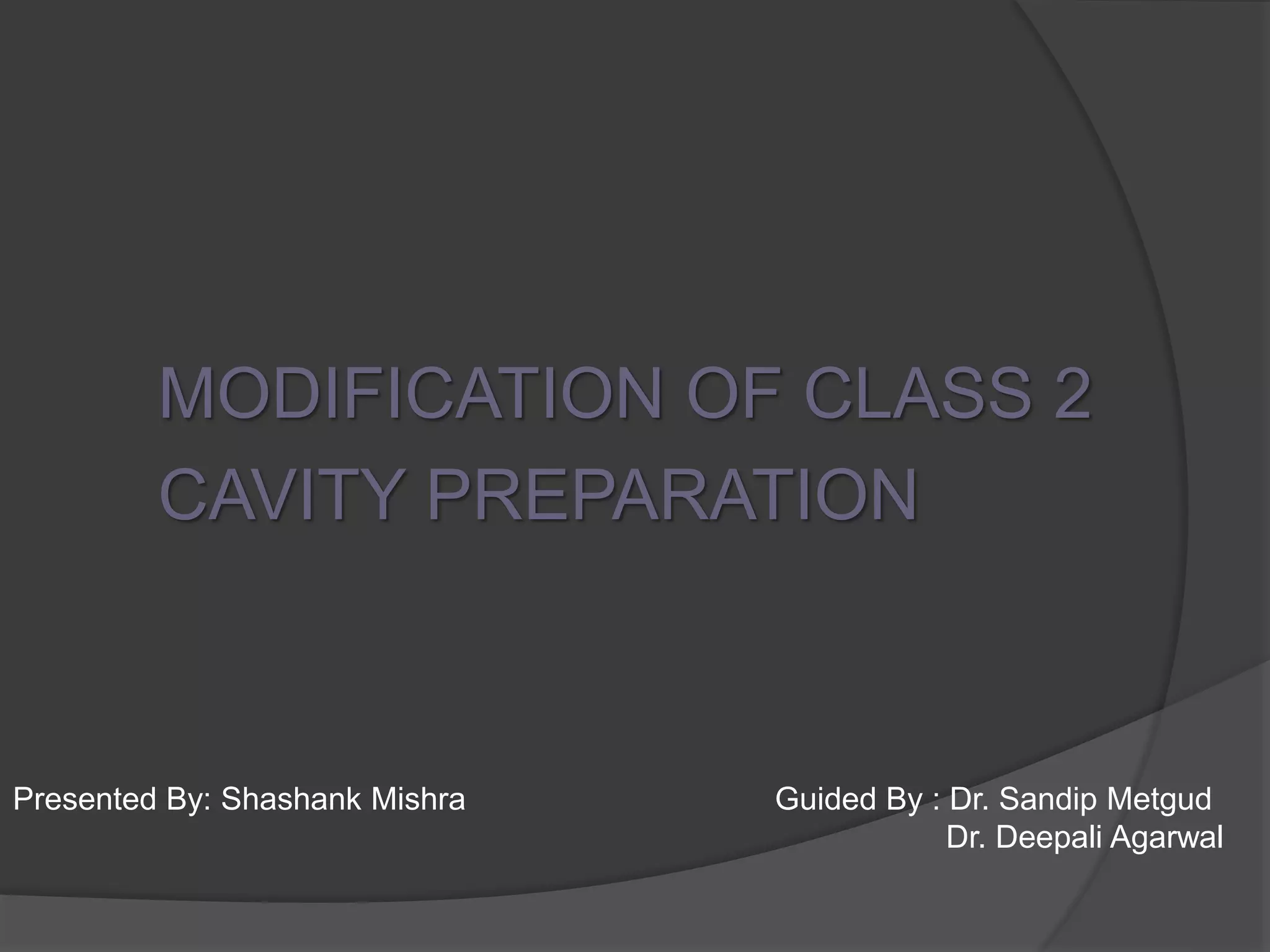 1) The document describes modifications to a standard Class 2 cavity preparation design based on factors like lesion size and location, tooth structure, and patient oral hygiene. 2) It presents 6 designs (labeled 1-6) that vary the cavity shape, locations of margins, and internal anatomy features to best suit different clinical situations. 3) Each design is indicated for specific caries patterns and locations, and involves different areas of the tooth structure, with variations in how the cavity preparation margins and walls are formed.