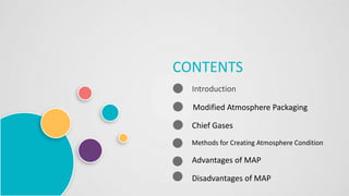 The document discusses modified atmosphere packaging (MAP), a technique that alters the internal atmosphere of food packages to extend shelf life by reducing spoilage mechanisms such as oxidation, bacterial action, and mold growth. It outlines the main gases used in MAP, the methods of passive and active packaging, and provides specific atmospheric conditions for various fruits and vegetables. The advantages of MAP include improved food quality and extended shelf life, while disadvantages include high costs and potential risks of food-borne pathogens.