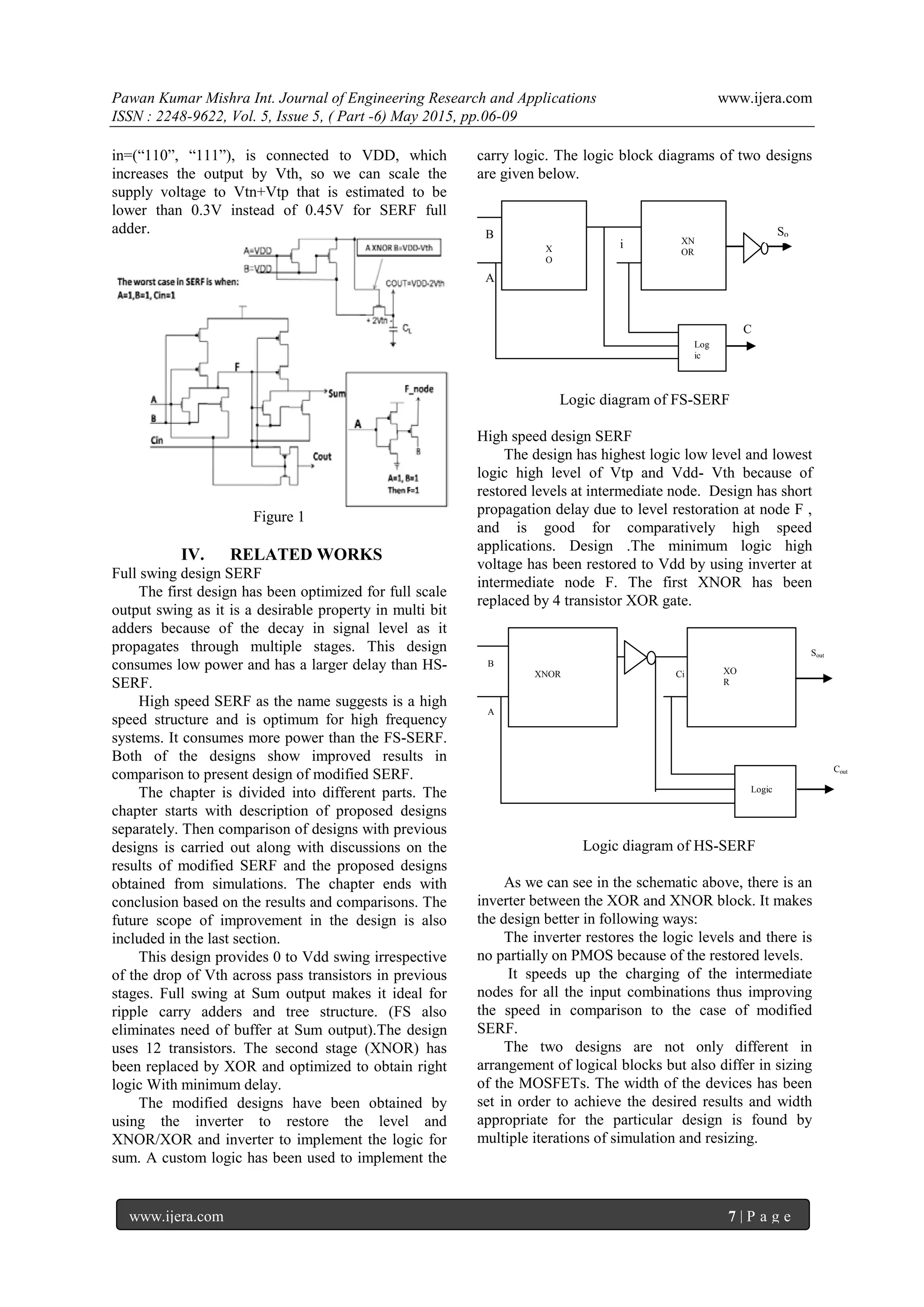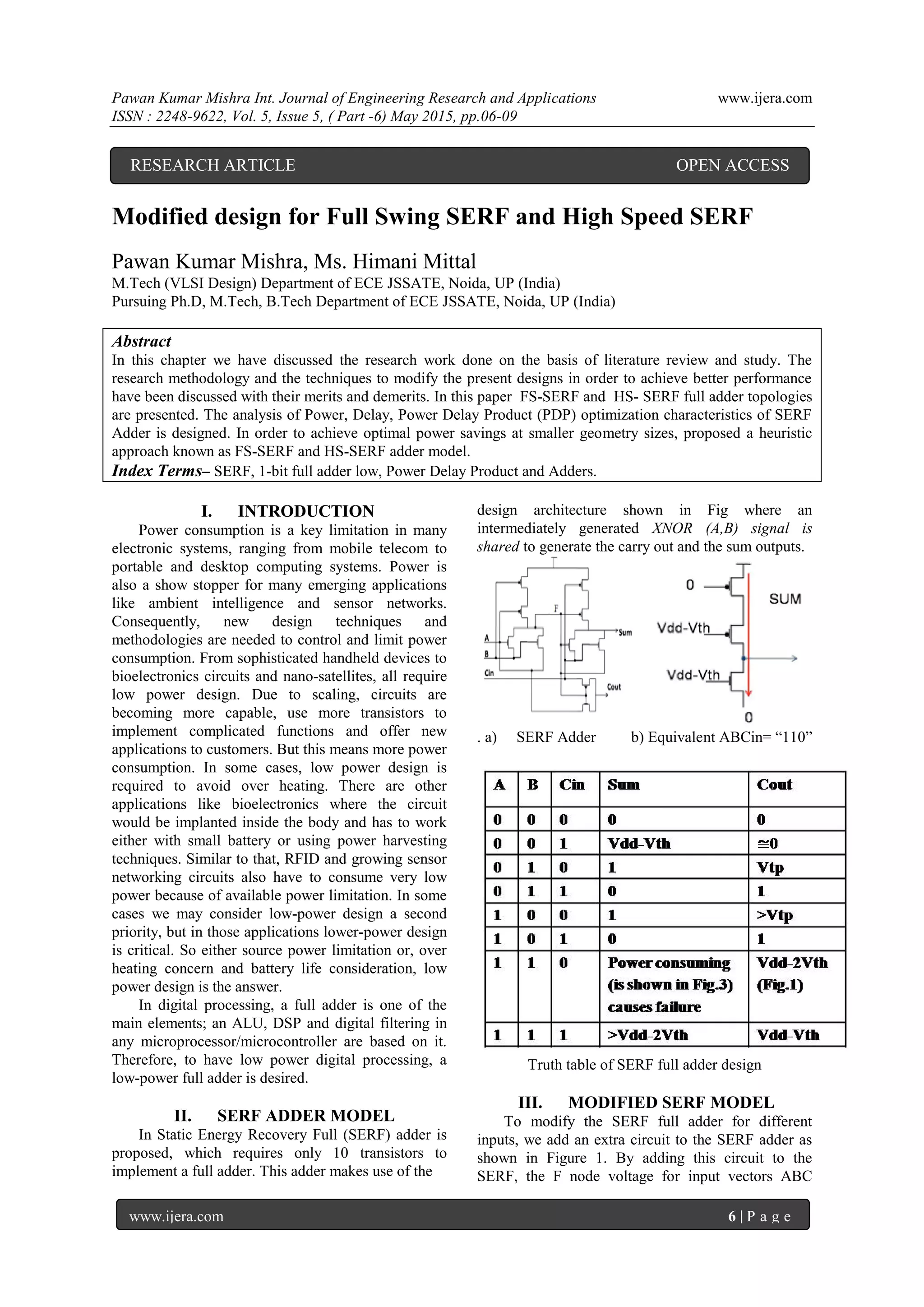 This document discusses research on modified full swing (fs-serf) and high-speed (hs-serf) adder designs aimed at reducing power consumption while maintaining performance in digital electronics. It presents a literature review, methodology, and results of simulations demonstrating the advantages of the proposed designs over traditional SERF (static energy recovery full) adder models. Key findings indicate that both fs-serf and hs-serf achieve lower power consumption and better power-delay product (PDP) metrics, with specific use-cases determining the best design selection.